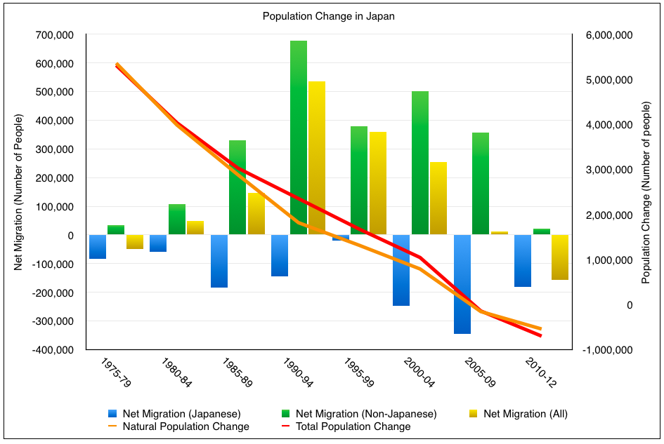 Every time I give a public lecture which features Japan's 21st century demographic structure someone inevitably asks whether immigration could be a 'solution' to Japan's depopulation 'problem'. I put those words in quote marks for emphasis because I don't necessarily think that depopulation is a problem requiring a solution; at least not in the conventional sense of the solution being to arrest decline. Anyway, here's why I think Japan might not increase immigration as a means of stabilising population numbers.