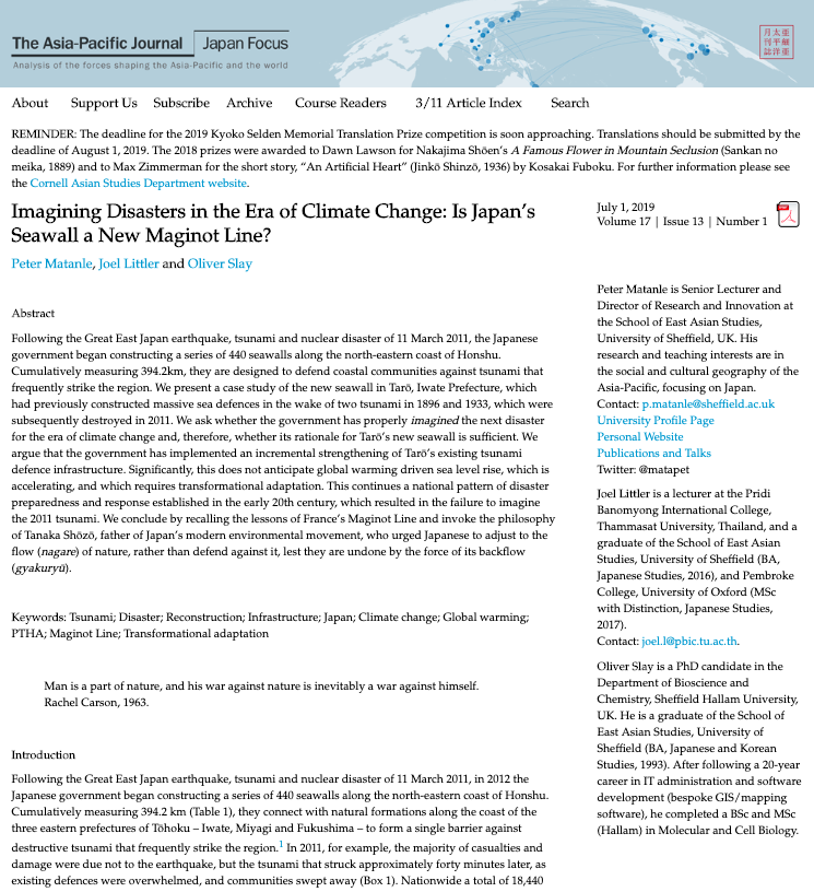 Abstract - Following the Great East Japan earthquake, tsunami and nuclear disaster of 11 March 2011, the Japanese government began constructing a series of 440 seawalls along the northeastern coast of Honshu. Cumulatively measuring 394.2km, they are designed to defend coastal communities against tsunami that frequently strike the region. We present a case study of the new seawall in Tarō, Iwate Prefecture, which had previously constructed massive sea defences in the wake of two tsunami in 1896 and 1933, which were subsequently destroyed in 2011. We ask whether the government has properly imagined the next disaster for the era of climate change and, therefore, whether its rationale for Tarō's new seawall is sufficient. We argue that the government has implemented an incremental strengthening of Tarō's existing tsunami defence infrastructure. Significantly, this does not anticipate global warming driven sea level rise, which is accelerating, and which requires transformational adaptation. This continues a national pattern of disaster preparedness and response established in the early 20th century, which resulted in the failure to imagine the 2011 tsunami. We conclude by recalling the lessons of France's Maginot Line and invoke the philosophy of Tanaka Shōzō, father of Japan's modern environmental movement, who urged Japanese to adjust to the flow (nagare) of nature, rather than defend against it, lest they are undone by the force of its backflow (gyakuryū).